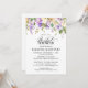 A caligrafia elegante e as bonito flores roxas e brancas de marfim criam este convite para chás de panela de aquarela.