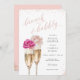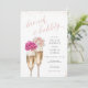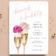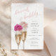 Este chá de panela elegante com detalhes de brilho rosegold e um script personalizado de "brunch and bubble" apresenta duas flautas de champanhe cintilante e flores cor d'água cor-de-rosa sobre elas.