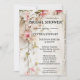 Chá de panela romântico com design de aquarela com flores cor-de-rosa em fundo rústico. Na parte traseira está um modelo de código QR (opcional) fácil de personalizar. Bonito para um casamento planejado no campo ou no jardim.
