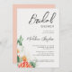 Um convite ao chá de casamento floral moderno e elegante com um belo arranjo de aquarela de flor selvagem numa paleta de branco, verde e laranja, combinado com um roteiro de caligrafia contemporânea para uma aparência romântica e de tendência.