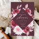 Celebrar um romântico casamento de outono com este elegante convite floral que inclui uma estrutura de diamante geométrico dourada, dahlias de burgundy de aquarela, peônias de pincel e folhagem de queda rústica. Perfeito para o exterior, jardim de vô ou casamentos rurais com um toque aconchegante e antigo.