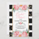 Convites de chá de panela personalizados com listras negras e brancas e lindas flores cor-de-água rosa - peões e decor de confete dourado.