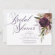 Chá de panela elegante com tipografia de script personalizada e lindíssimas flores roxas de aquarela e douradas em um buquê solto.