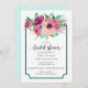 Apresentar um chá de panela com um convite personalizado com um vibrante buquê floral em tons de aquarela, cor-de-rosa, magenta, fuchsia e roxo com folhas verdes e aqua para destacar o buquê. Uma profunda cinza de carvão e uma fronteira aqua rodeiam o seu texto com recurso na moda. O lado inverso do convite tem um padrão striped estreito correspondente em aqua e branco.