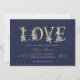 convites de chá de panela impressos personalizados do barato personalizados com os detalhes do seu partido. Este elegante design apresenta uma tipografia faux gold foil LOVE com delicados florais de aquarela num fundo azul marinho em negrito. Use as ferramentas de design para personalizar o texto, editar as fontes e as cores ou adicionar suas próprias fotos para criar um convite de chá de casamento e classe.
