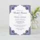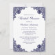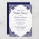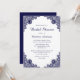 Convites de chá de panela azuis e brancos do marinho elegantes, com um espaço floral azul marinho e uma fonte elegante de script. Personalizar facilmente online. Itens correspondentes disponíveis para complementar esses convites de chá de panela de safra azul-marinho.