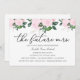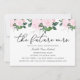 Elegante design de chá de panela com as palavras "a futura sra." em um roteiro elegante moderno com lindas flores cor-de-rosa acima e detalhes de festas abaixo.