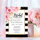 Trendy e moderno convite para modelos editáveis para chá de panela em listras brancas e negras. Moldura de ouro fino com flor rosa-d'água na esquina. Todo o texto pode ser editado e alterado; fonte, cor e tamanho. Entre em contato com o designer para obter outras variações ou ajuda.