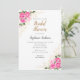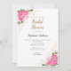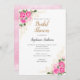 Este elegante design floral é perfeito para convites de chá de panela de moda. O texto é enquadrado com buquês de rosas de aquarela púrpura e sotaques florais de ouro em dois cantos opostos.