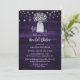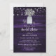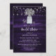 Lindo chá de panela floral roxo e rústico personalizado com flores para o hálito de bebê dentro de jarro contra um fundo de madeira de celeiro adornado com luzes de cordas. Personalize facilmente esses convites de chá de panela roxos bonitos com seus detalhes de eventos.
