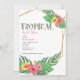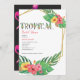 Convites tropicais exóticos, contendo letras "tropicais" florais com palmeiras exóticas e padrão floral tropical aquícola no verso.