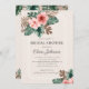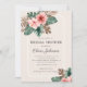 Design de chá de panela de casamento elegante com flores cor-de-água rosa e poeirentas e folhas tropicais sobre fundo creme.