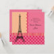 O convite temático francês e legante. Apresenta um desenho da Torre Eiffel em um fundo cor-de-rosa e creme. As tiras e o padrão de bolinhas dão a este design um olhar moderno. Localizar produtos correspondentes nesta loja.