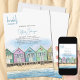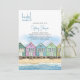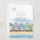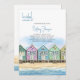Convite de Fim de Semana da Bachelorette de Praia com Itinerário. Design de aquarela com uma fileira de cabanas coloridas e pintadas de praia de madeira na areia ouro da frente do oceano, aproveitando as vistas do mar na linha de frente e o céu azul de verão. O modelo está preparado para você adicionar detalhes do fim de semana e organizador com seu itinerário de fim de semana no verso. Se você precisar fazer ajustes nos cabeçalhos ou no espaçamento, por exemplo, clique em "editar usando a ferramenta design".