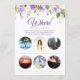 Adicione seu próprio toque especial a esse ouro divertido e a este cartão de chá floral de cor d'água roxa com a marca floral ou casal com o jogo, "Onde eles estavam?". Este design versátil apresenta a tipografia moderna e seis das suas fotos favoritas. Altere facilmente as cores para corresponder ao tema do evento.