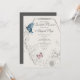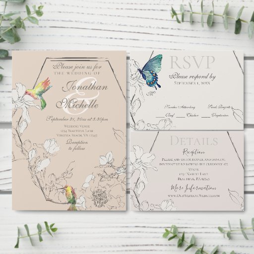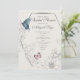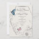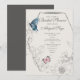 Este chá de panela floral geométrico apresenta duas belas borboletas, um azul dramático e um bonito rosa. Eles estão empoleirados em um arranjo de flores elegante que está lindamente entrelaçado com um hexágono artístico de cinza escura. Este convite é feito em tons de cinza, bege, azul e rosa.