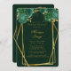Design apresenta um elemento floral colorido impresso em tons de esmeralda verde e ouro. Texturas de canvas verde com falso quadro geométrico em ouro e florações de pedras com script de caligrafia em ouro ou escrevendo de tipo. Excelente para as comemorações do casamento!