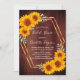 Um fundo marrom rústico de celeiro de madeira. Um quadro geométrico dourado. Com o texto: Chá de panela e o nome da noiva na frente, escrito com um moderno estilo escrito à mão. Cartas brancas.
