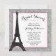 Chic Paris temia convites de chá de panela. Mostrado em rosa claro e preto. Apresentando uma ilustração da torre Eiffel com um fundo falso de brilho prateado. Os designs são gráficos impressos planos - NÃO É O GLITTER REAL. Gráficos por Ilustrações JW