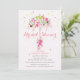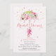 Um convite bonito para uma noiva ou chá de fraldas com um guarda-chuva feito de flores rosas e azuis com folhas verdes. Um arco cor-de-rosa com flores está amarrado ao punho. O fundo rosa macio tem um padrão listrado sutil e flores e pétalas cor-de-rosa caindo. (Gráficos AMBilustrações ©2017)