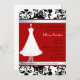 chá de panela formal feito em uma cor damasco branca e preta, na parte superior e inferior. Um lindo vestido de noiva em um stand decorativo decora o lado esquerdo do convite, com um fundo vermelho e uma área de texto. Os gráficos de fita de aparência branca delimitam a parte superior e inferior da área de texto. Personalize o texto para atender às suas necessidades de evento de casamento.