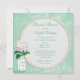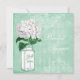 Convites de chá de panela elegantes, de cor verde-menta e branca, com um frasco de maçã branca e verde, e ilustração bonito de flor branca de hydrangea vintage, numa colagem na moda antiga, de cor verde-de-menta, com belas decorações de ornamentado branco, uma libélula e um escrevendo desbotado em um padrão na moda de harlequin. No verso dos convites está uma glamourosa pérolas brancas impressas e um tapete de renda com texto para você personalizar com os detalhes da sua festa. Convites clássicos, modernos, modernos e modernos perfeitos para chás de primavera, verão, outono / outono e inverno. Todo o texto pode ser facilmente personalizado para atender às suas necessidades e você pode alterar o estilo da fonte, a cor e o tamanho da fonte, se desejar. Tenho produtos de casamento na minha loja. Se precisar de assistência para personalizar o seu produto, entre em contato comigo pela loja e terei todo o prazer em ajudar. ©Hazel Kinvig-Paul (www.design-a-dream.co).