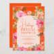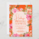 Convide seus convidados para comemorar com este chá de panela vibrante e na moda boho, com um fundo laranja ousado, enfeitado com flores impermeáveis pintadas à mão em tons de rosa, pêssego e verde. A tipografia moderna e brincalhona e a escrita elegante fazem com que este convite seja perfeito para um chá de panela moderno e alegre. O design é personalizável, permitindo que você personalize facilmente os detalhes para ajustado de seu evento. Faça uma declaração corajosa com este convite que captura o espírito de uma celebração alegre.