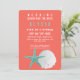 Convites de chá de panela de praia tropical. Laranja-coral brilhante e azul-azul-turquesa, com texto tipográfico branco. Um grande peixe-estrela e um dólar de areia decoram o fundo para representar o casal. O nome da noiva é impresso em turquesa para se destacar. Adicione espaços entre as letras do nome dela, se preferir. Incluir informações do registro e/ou um site de casamento.