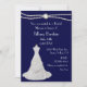 chá de panela maravilhoso em azul marinho, com gráficos de uma dupla fita de pérolas no topo, e um vestido branco de casamento, no fundo esquerdo. O texto em branco é totalmente personalizável para atender às suas necessidades. O convite elegante para a noiva ser apreciada por anos.