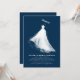 Estes convites de chá de panela capturam lindamente a essência das emoções da noiva e o espírito romântico do casamento. O design é elegante e minimalista, apresentando uma silhueta graciosa da noiva num vestido de noiva branco impressionante. Essa imagem cria uma atmosfera sonhadora e romântica, evocando sentimentos de poesia e nostalgia. A ilustração, com suas braçadeiras grossas, semelhantes a pincéis, se mistura perfeitamente em um fundo azul marinho profundo, melhorando a estética geral. A simplicidade, ainda que profunda, do impacto da design eloquentemente transmite a beleza e elegância tanto da noiva como do seu casamento, deixando uma impressão duradoura do dia especial.