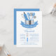 Estoque moderno o chá de panela da cozinha com uma tigela misturadora cheia de ferramentas da cozinha, realçada com uma faixa azul moderna e colocada sobre um fundo branco contemporâneo. Visite o nosso compro para ver o convite do nosso chá de casamento de utensílios na moda numa variedade de cores de casamento populares.