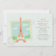 Um convite encantador para o tema Paris, com a Torre Eiffel como selo postal. As cores sutis são emparelhadas com um fundo úmido verde de espuma marinha. Bem adequado para qualquer celebração feliz.