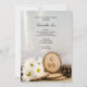 Convide convidados para a sua festa informal, mas elegante, com o encantador Chá de panela de Florestas Naturais Russas dos Brancos Brancos. Personalize-o com os detalhes específicos do seu chá de casamento e as iniciais do casal na fatia de madeira. Este casual e clássico costume de matas ou Chá de panela temático da floresta Invite apresenta uma fotografia em estilo natural de um buquê de flores margaridas brancas, fatias de madeira, cone de pinho e véu-brida branco com um fundo de burlap e cebola branca.