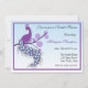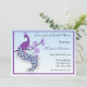 Um chá de panela com pavão roxo com penas azuis e roxas sentadas sobre um galho com flores roxas claras sobre fundo azul claro com borda roxa. Fácil de personalizar para qualquer ocasião. Alguns gráficos ©Riefka Designs