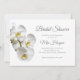 Chá de panela de orquídeas brancas em papel horizontal. As orquídeas brancas realistas com centros amarelos decoram o lado esquerdo do papel branco com texto personalizado de cinza escura. design para um evento temático tropical bonito e subestimado para celebrar a Noiva. Uma placa de tamanho menor é mostrada e pode ser alterada. O reverso é uma cinza sólida.