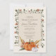 Bonita, rústica queda/convite para o almoço do chá de panela floral de outono com abóboras, folhas e folhagem cor de laranja, branca e verde.