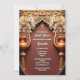 Dois belos e falhos ouro e elefantes índios adorados de hena branca são colocados estrategicamente em ambos os lados de uma arca do templo e acima de pilares reais. O arco enquadra modelos de texto branco para sua redação personalizada. Acima dos elefantes estão elegantes pinheiros florais. Os tons ricos e quentes de marrom, burgundy e ouro dão uma sensação de mercado e eterno ao design geral. A parte traseira tem o mesmo design e modelos extras para informações adicionais que você pode querer fornecer aos seus amigos e familiares. Se esta modelo não for necessária, basta suprimir a redação. Este design tradicional e luxuoso é ideal para qualquer chá de panela hindu tradicional; celebração asiática étnica ou evento híndi.