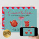 Esta safra, retrô, 1950, Chá de panela estilhaçada em tons antigos de vermelho e azul turquesa é perfeita para sua festa de chá de Chá de panela! O conjunto de bule de polkadot vermelho e branco, morangos, creme e botões retro aparecem nesse design único. Para itens correspondentes e edições personalizadas, contacte o Designer LeahG.