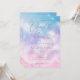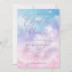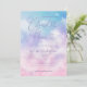Cartão de chá de panela brilhante e romântico com ilustração aquosa de cor púrpura, rosa e azul com nuvens e estrelas. O texto diz "a noiva está na nuvem nove."
