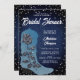 Um moderno, elegante e chic denim e chá de panela de diamantes que apresenta um fundo denim, uma bota azul-denim com um rosa elegante coberto de rochas (este é um efeito digital), e tipografia em branco. Um design chic, na moda e clássico de "denim e diamantes" para uma noiva moderna que ama denim!