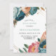 Um arranjo floral de cor aquosa impressionante que inclui turquesa, menta escura, pêssego, e pêssegos e rosas escuros, acentuado lindamente com elementos de diamante e folhagem verde profunda. Perfeito para convites de casamento elegantes!