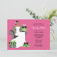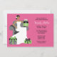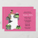 Convide os convidados para um chá de panela de estilo com este chá de panela moderno e divertido. Este convite cor-de-rosa e verde apresenta uma noiva afro-americana sentada numa cadeira cercada de presentes.