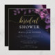 Rosas, orquídeas e folhas de eucalipto, desenhadas à mão em lápis colorido e revestidas digitalmente com roxo, fazem um chá de panela moderno, sofisticado, elegante e chico. O fundo azul preto e escuro com pistas de roxo e luzes iluminam o céu da meia-noite. A elegante caligrafia, na matiz do ouro, torna esse convite na moda preto e roxo ainda mais elegante.