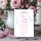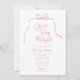 Ela é casando! Chá de panela Rosa Simples. Um arco de estilo giro e desenhado à mão e uma fita emparelhados com fontes escritas à mão. Simples, mas brincalhão. O verso do convite inclui uma garrafa desenhada à mão, com uma fita amarrada. Personalize o padrão do rótulo do frasco com as primeiras iniciais da noiva e do noivo para adicionar esse toque especial extra. © Kimbellish, LLC