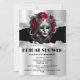 O rosto de uma bela mulher com pele de cinza prateada e lábios vermelhos rubis escuros e vermelhos está vestindo uma máscara ornamentado, falsa decorativa, de olho prateado, que tem grandes rosas de satin e plumas nela. Ela é colocada contra um fundo preto e prateado falso brilhante com modelos pretas editáveis. Essa elegante, luxuosa, trendy e glam design é ideal para uma despedida de solteira, aniversário, doce dezesseis ou quinceanera. Simplesmente personalize os modelos de texto editáveis para se adequar à sua ocasião especial.