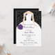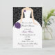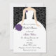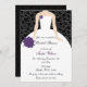 Linda Chá de panela Convida, com uma noiva de vestido branco de casamento segurando um buquê de casamento de flores roxas, em uma cor damasco elegante. Mod e Na moda