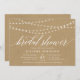 Nossos convites de chá de panela elegantes rústicos apresentam um fundo kraft com cordas de luzes brancas no topo, e "chá de panela" na tipografia de scripts de caligrafia. Personalize com seu chá de panela e detalhes do registro abaixo em letras brancas.