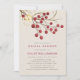 Belo chá de panela rústico para um casamento no inverno. Apresenta bagas de fogo vermelhas em um galho nu decorado com uma campainha de ouro e fio. O chá de panela e o nome da noiva estão em vermelho - assim como a parte de trás do convite para o chá de panela. O texto restante é cinza escura em uma combinação clássica de fontes verticais e itálicas.
