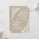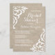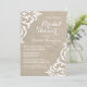 Este chá de panela rústico e elegante apresenta um fundo de aparência de burlap com um design branco esmaecido correndo ao longo da borda. A mistura perfeita de materiais rústicos com a elegância de detalhamento damask. Perfeito para o seu chá de panela de celeiro, ao ar livre, campo, rústico, casamento vintage ou tema elegante.