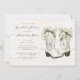 Um chá de panela rústico de serra aquática com botas florais de cowgirl, contra um fundo de madeira branca. Tire suas botas favoritas e se prepare para um encontro memorável cheio de risos, amor e celebração! Peça seus convites em impressão, downloads digitais ou ambos!